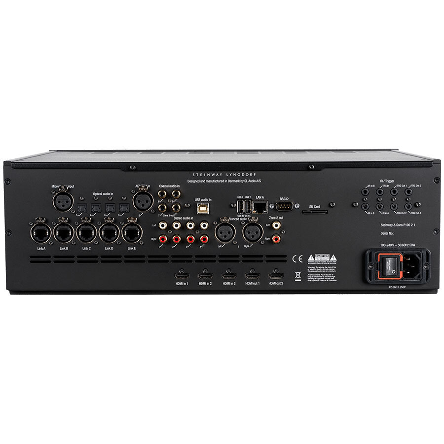 Выходы: аудио: 5 x цифровых выходов Steinway Lyngdorf (на базе CAT 5e), 1 x несимметричный аналоговый стереовыход для дополнительного аудиовыхода, 1 x коаксиальный цифровой выход SPDIF, 1 x HDMI™ — Видео: 2 x HDMI 2.1 (HDCP 2.3)